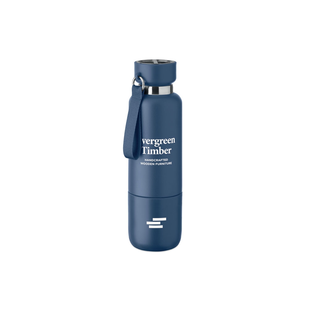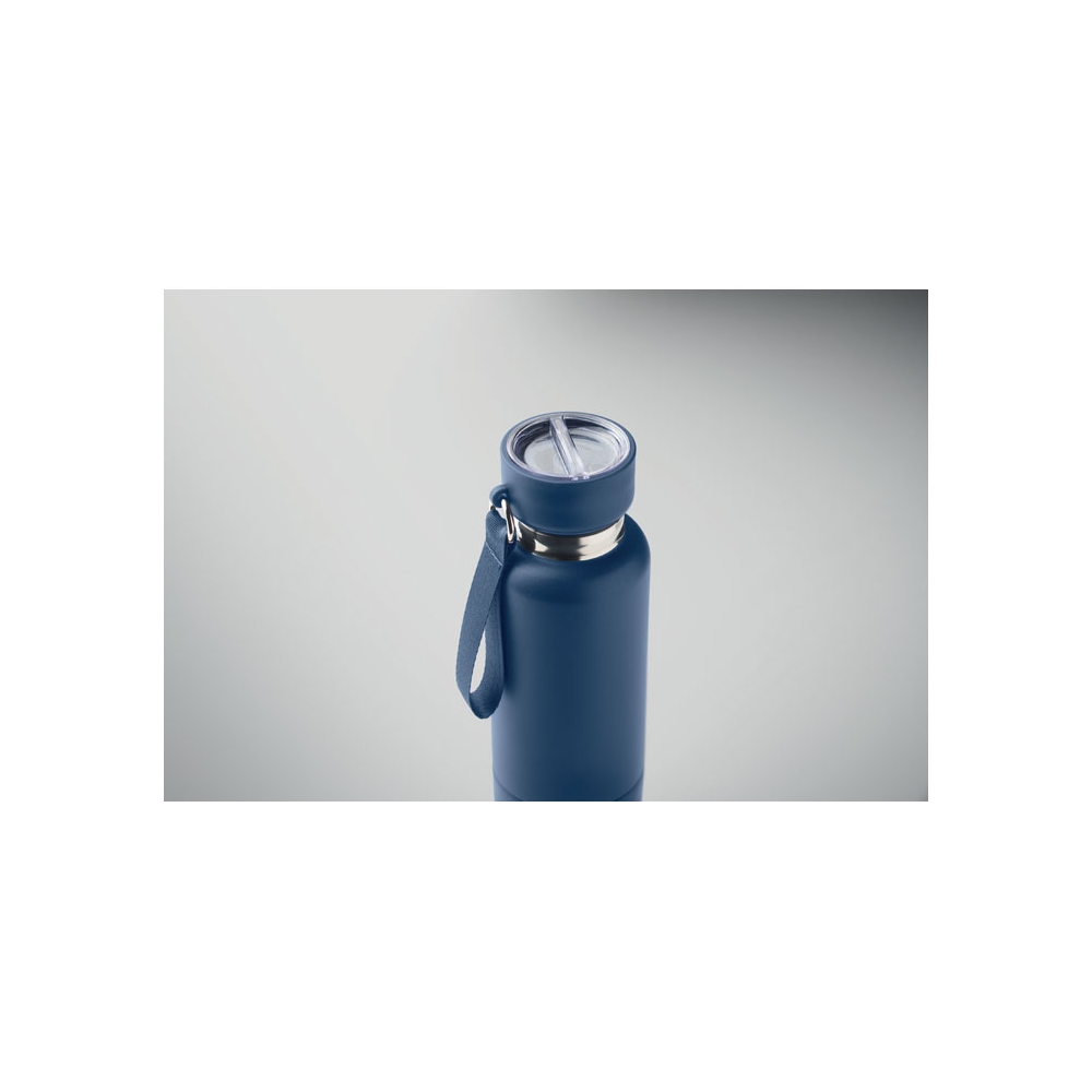 Artikel-Nr: OCBMO2716-85Doppelwandige Isolierflasche aus recyceltem Edelstahl (90 % recycelter Edelstahl und 10 % Edelstahl). Inkl. Becher im Boden, Handschlaufe und zusätzliches langes Band (70 cm) verstaut im Deckel aus PP. Auslaufsicher. Füllmenge: 500 ml.