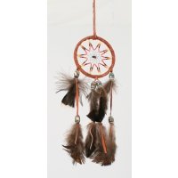 Artikel-Nr: 375105350Dekoratives Windspiel und trendiger Wandbehang für drinnen. Nach Überlieferung der amerikanischen Ureinwohner fängt der Dreamcatcher, über das Bett gehängt, schöne Träume ein. Die bösen Träume werden weggezaubert. Aus Leder. Mit echten Federn und bunten Perlen. Drei Farben sortiert.