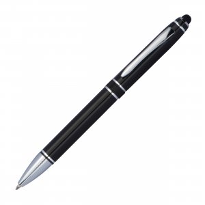 Artikel-Nr: MCM1363603Hochwertiger Drehkugelschreiber aus Aluminium mit blau schreibender Mine, silbernen Applikationen und Touchfunktion in einem Papier Etui. Ihre Werbung wird rechts vom Clip graviert.