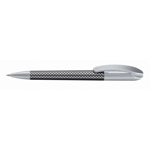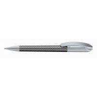 Drehkugelschreiber mit silbernem Oberteil, Schaft im Carbon-Look und schwerer matt verchromter Metallspitze.