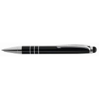 Mini Metall-Drehkugelschreiber mit gummierter Oberseite für die Touchscreensteuerung. Metallzierringe und Beschlagteile glanzverchromt.