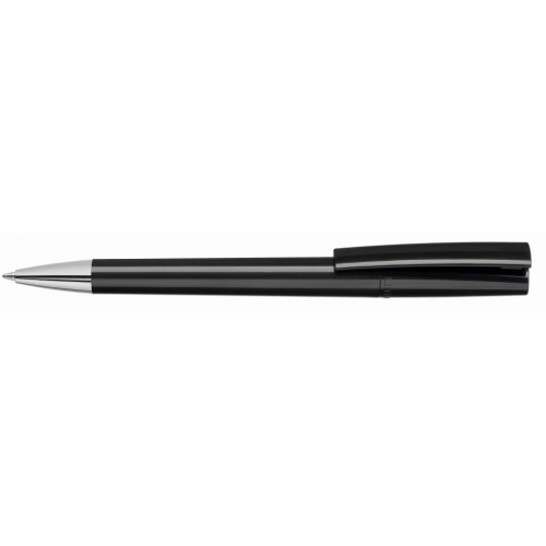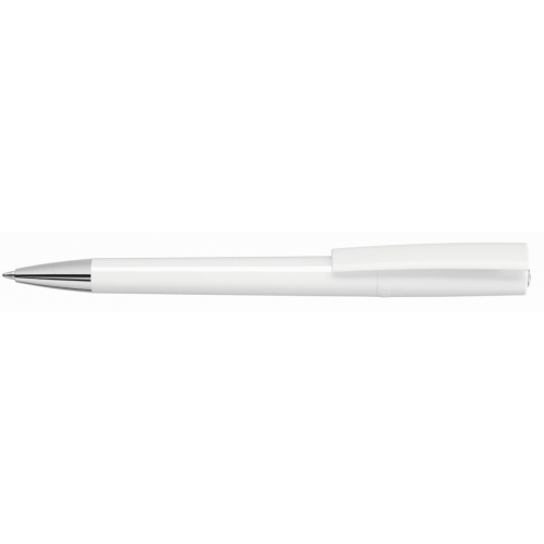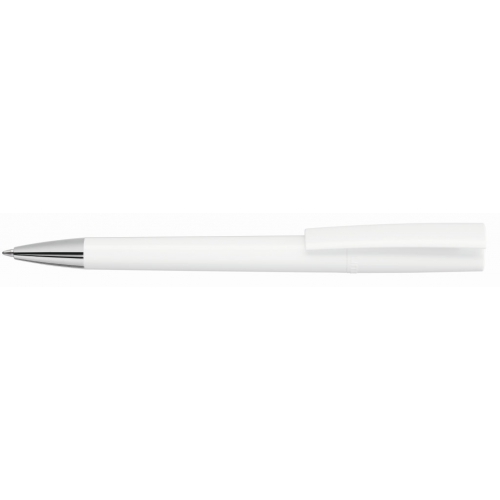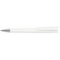 Drehkugelschreiber mit weiß oder schwarz glänzend gedecktem Gehäuse, silbernem Stopfen im Oberteil und schwerer Metallspitze glanzverchromt.