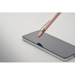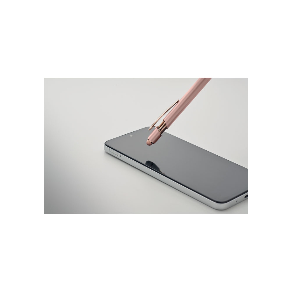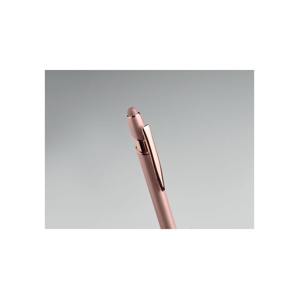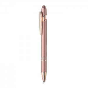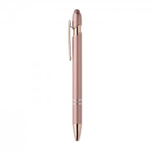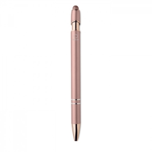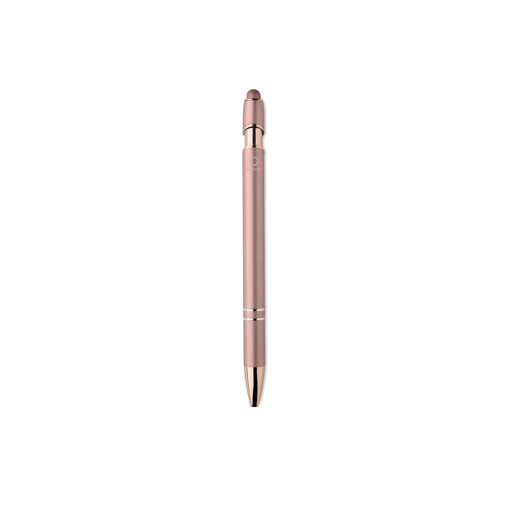 Artikel-Nr: OCBMO2380-95Druckkugelschreiber mit Stylus aus recyceltem Aluminium mit rosé goldenen Details. Blaue Tinte.