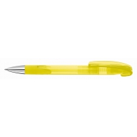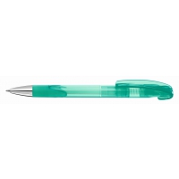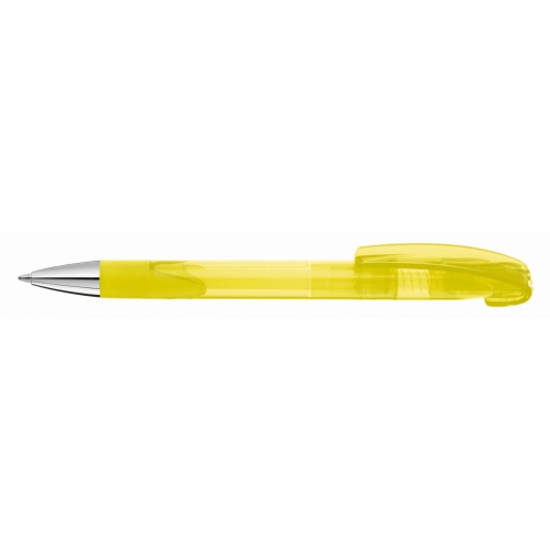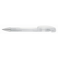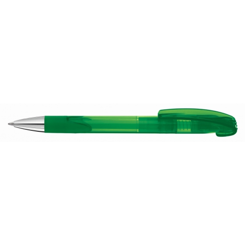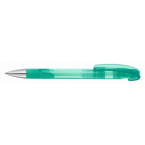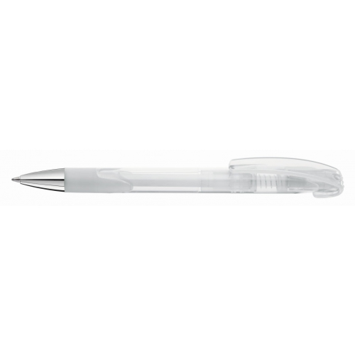 Artikel-Nr: 60200122TSIDruckkugelschreiber mit transparent glänzendem Gehäuse, schwerer glänzender Metallspitze, geschwungenem Clipdrücker und Gummigriffzone.