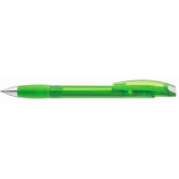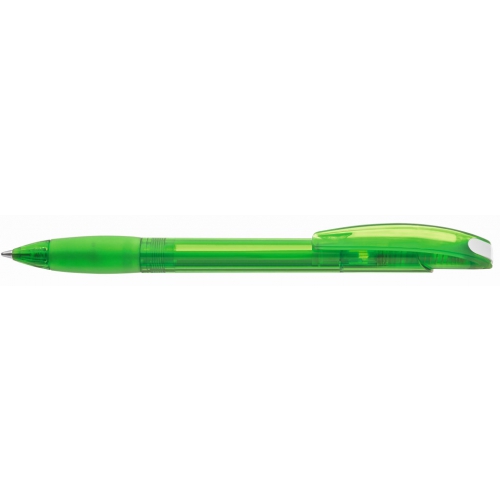 Artikel-Nr: 60200112TDruckkugelschreiber mit transparent glänzendem Gehäuse und gepolsterter Softgriffzone mit Clipdrückermechanik. Bogenclip mit silber glänzendem Drückerstopfen.