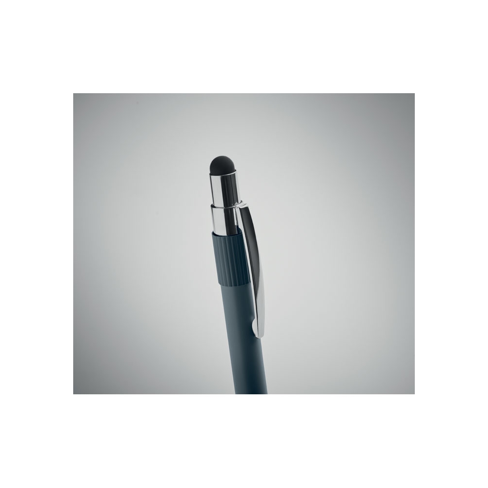 Artikel-Nr: OCBMO2488-85Druckkugelschreiber aus recyceltem Aluminium mit Stylus und Anti-Stress-Spinner-Funktion. Blaue Tinte.