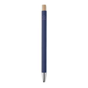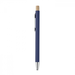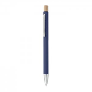 Artikel-Nr: OCBMO2309-04Druckkugelschreiber aus recyceltem Aluminium mit Druckknopf aus Bambus. Silberne Spitze und Clip. Blaue Tinte.