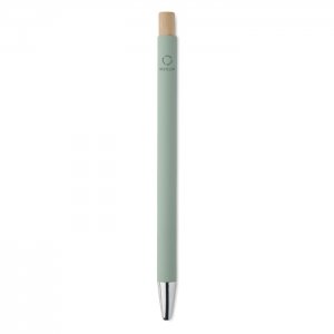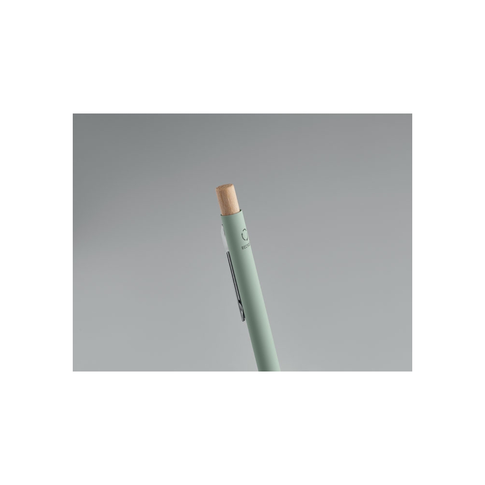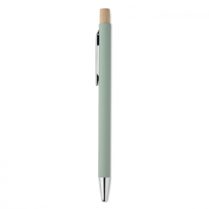 Artikel-Nr: OCBMO2309-77Druckkugelschreiber aus recyceltem Aluminium mit Druckknopf aus Bambus. Silberne Spitze und Clip. Blaue Tinte.
