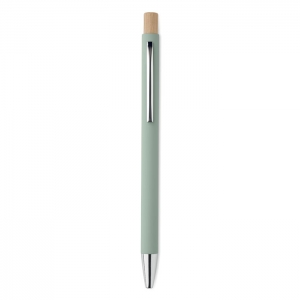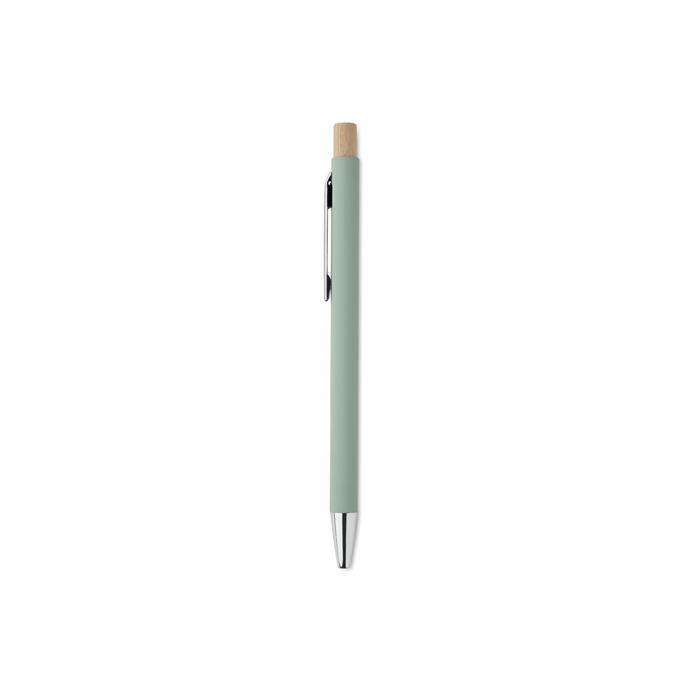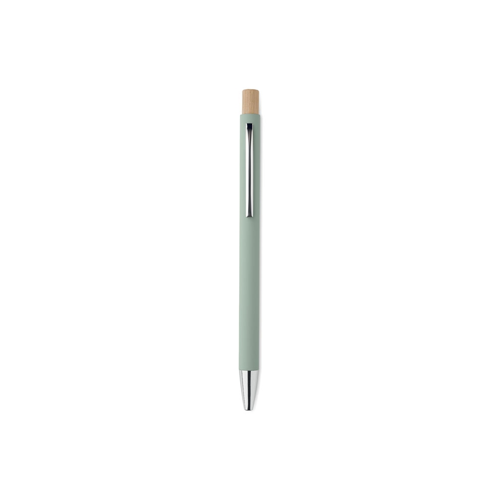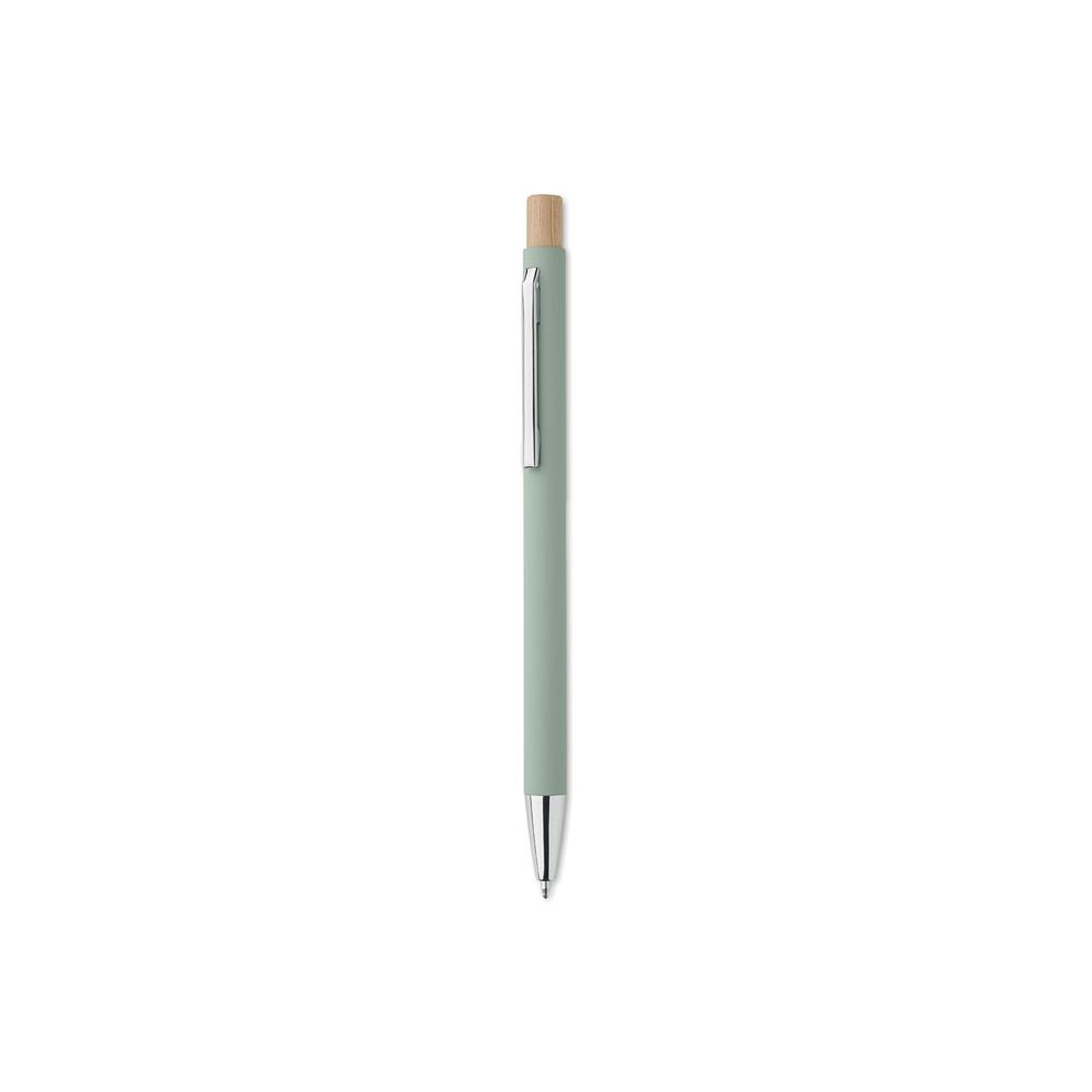 Artikel-Nr: OCBMO2309-77Druckkugelschreiber aus recyceltem Aluminium mit Druckknopf aus Bambus. Silberne Spitze und Clip. Blaue Tinte.