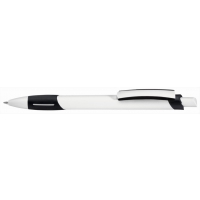 Artikel-Nr: 60200039Druckkugelschreiber in weiß mit uni transparent gefrosteter oder gedeckt schwarzer Softgriffzone, Zierring und Clipschale.
