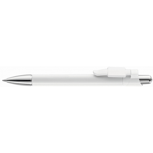 Druckkugelschreiber in weiß mit Spitze und Drücker in silber glänzend