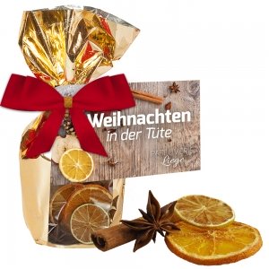 Artikel-Nr: FNM01963Goldfolienbeutel mit Werbekarte. Werbeanbringung als Werbekarte in 4c individuell bedruckbar. Zutaten Duft-Deko: Getrocknete Orange, getrocknete Limette, Zimt, Sternanis, Aroma.