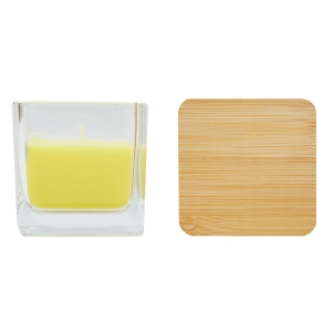 Artikel-Nr: INP56-0901902Duftkerze GLOW: in quadratischem Glas, farbiges Wachs mit Zitronen-Duft, Bambusdeckel mit Silikon-Dichtring, Brenndauer ca. 8 Stunden