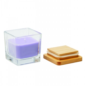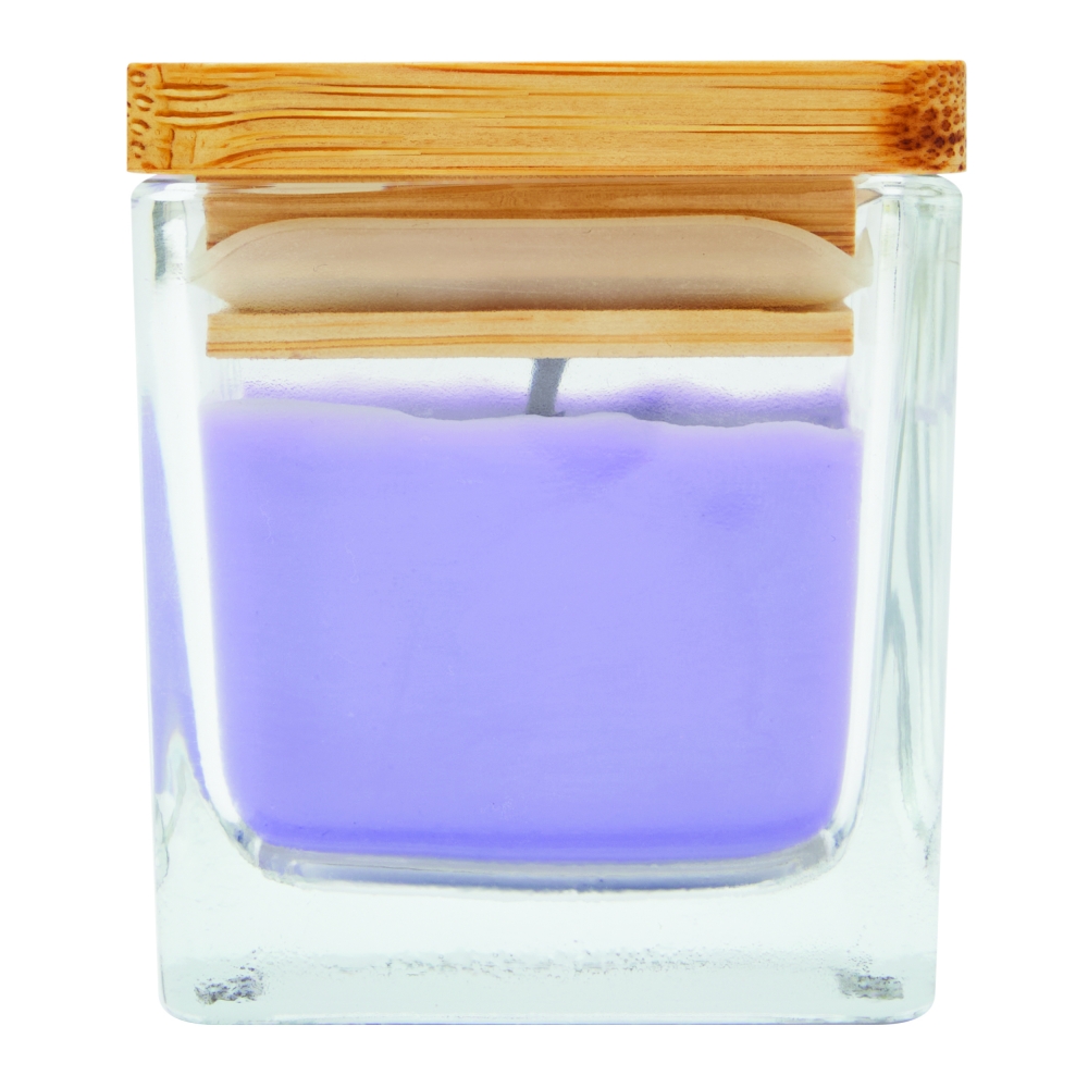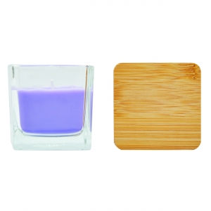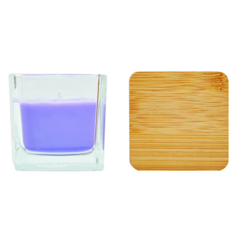 Artikel-Nr: INP56-0901905Duftkerze GLOW: in quadratischem Glas, farbiges Wachs mit Lavendel-Duft, Bambusdeckel mit Silikon-Dichtring, Brenndauer ca. 8 Stunden