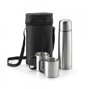 Artikel-Nr: PST94609-107Set bestehend aus Isolierkanne (500 mL) und Tassen aus Edelstahl. Doppelwandige Isolierkanne mit 2 Tassen (je 200 mL) und 1 Tasche aus 600D mit verstellbarem Tragegurt. Tasche: 155 x 250 x 90 mm