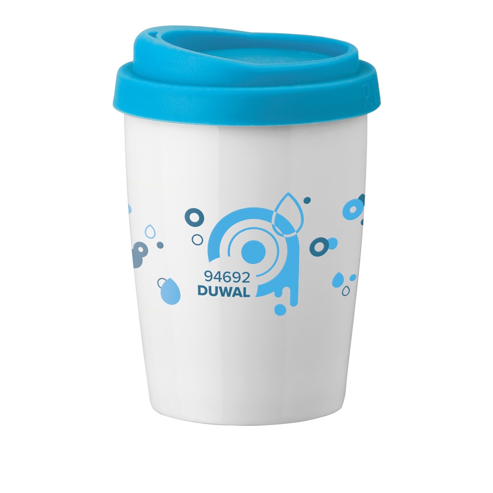 Artikel-Nr: PST94692-124Reisebecher aus Porzellan, doppelwandig, luftisoliert und mit Silikondeckel (220 mL). Geliefert in einer Schachtel. ø86 x 122 mm