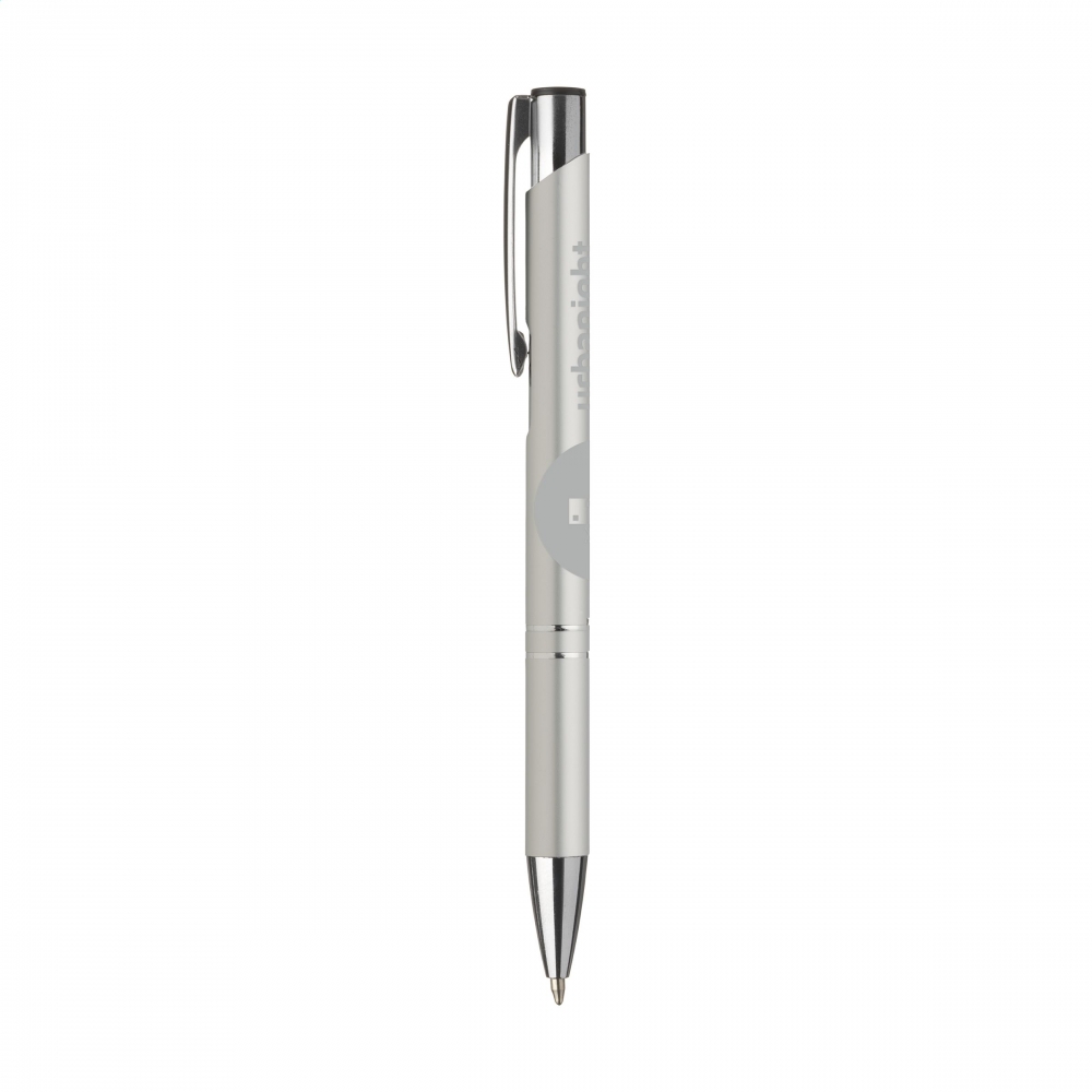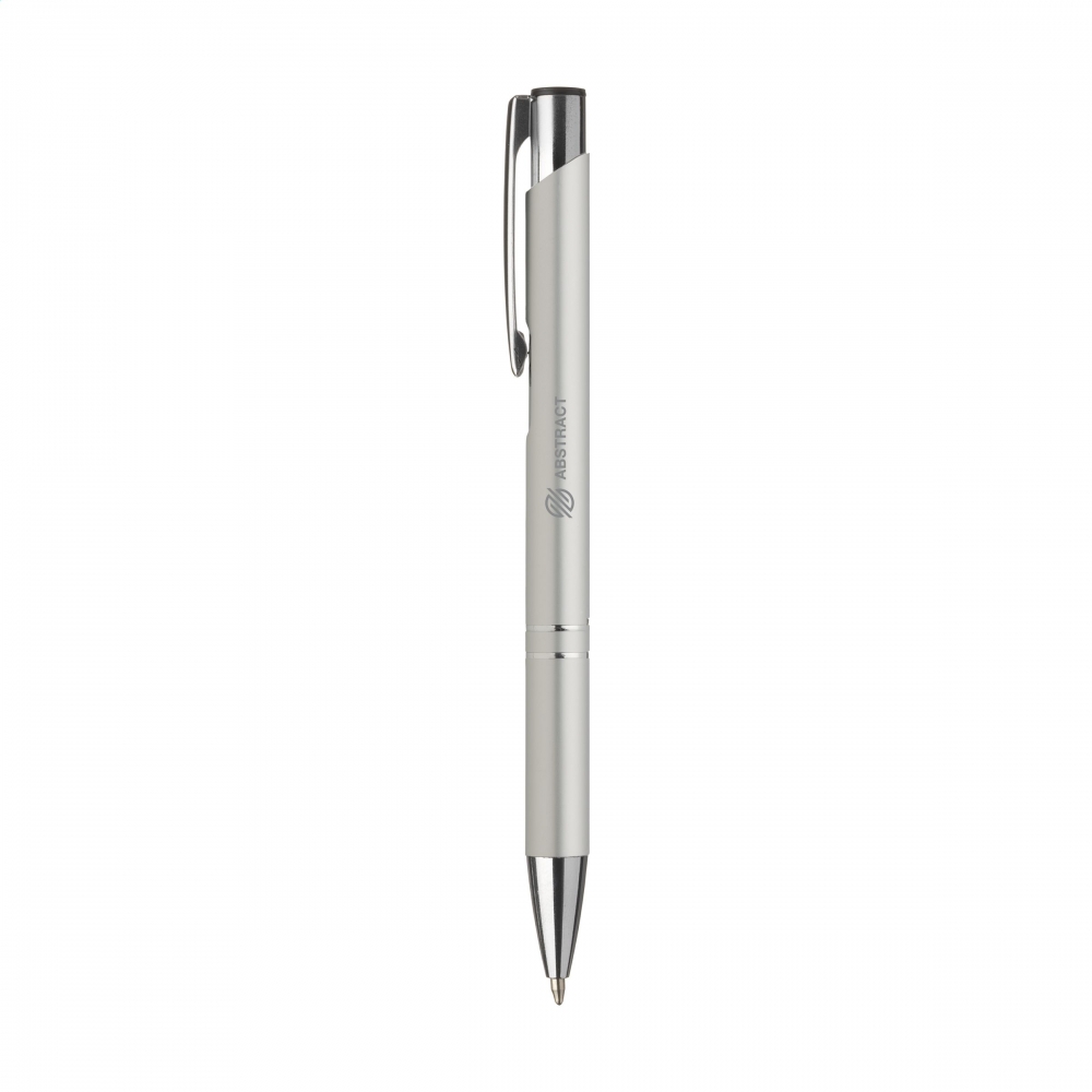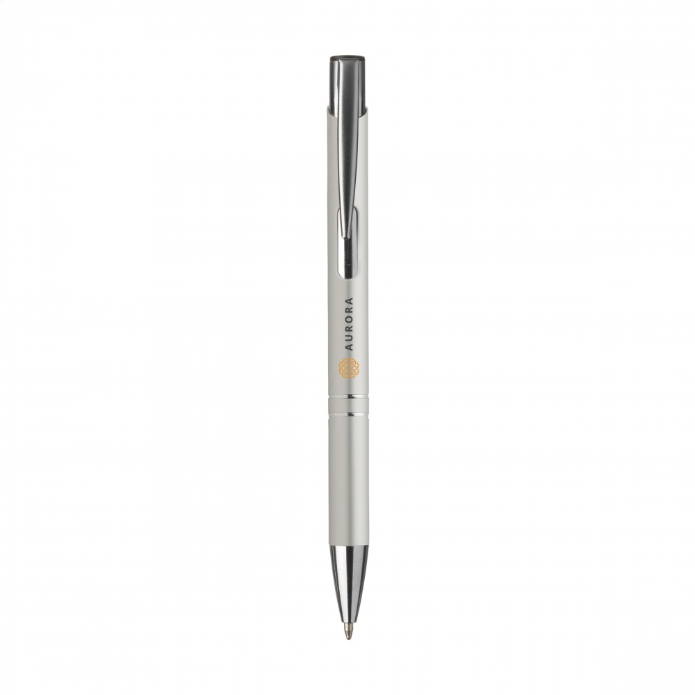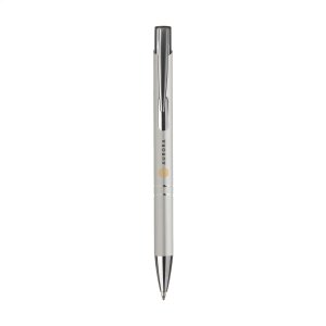 Artikel-Nr: CLP25690121Blauschreibender oder schwarzschreibender Kugelschreiber aus Aluminium mit mattfarbenem Gehäuse in Metalloptik und metallenem Clip / Druckknopf.