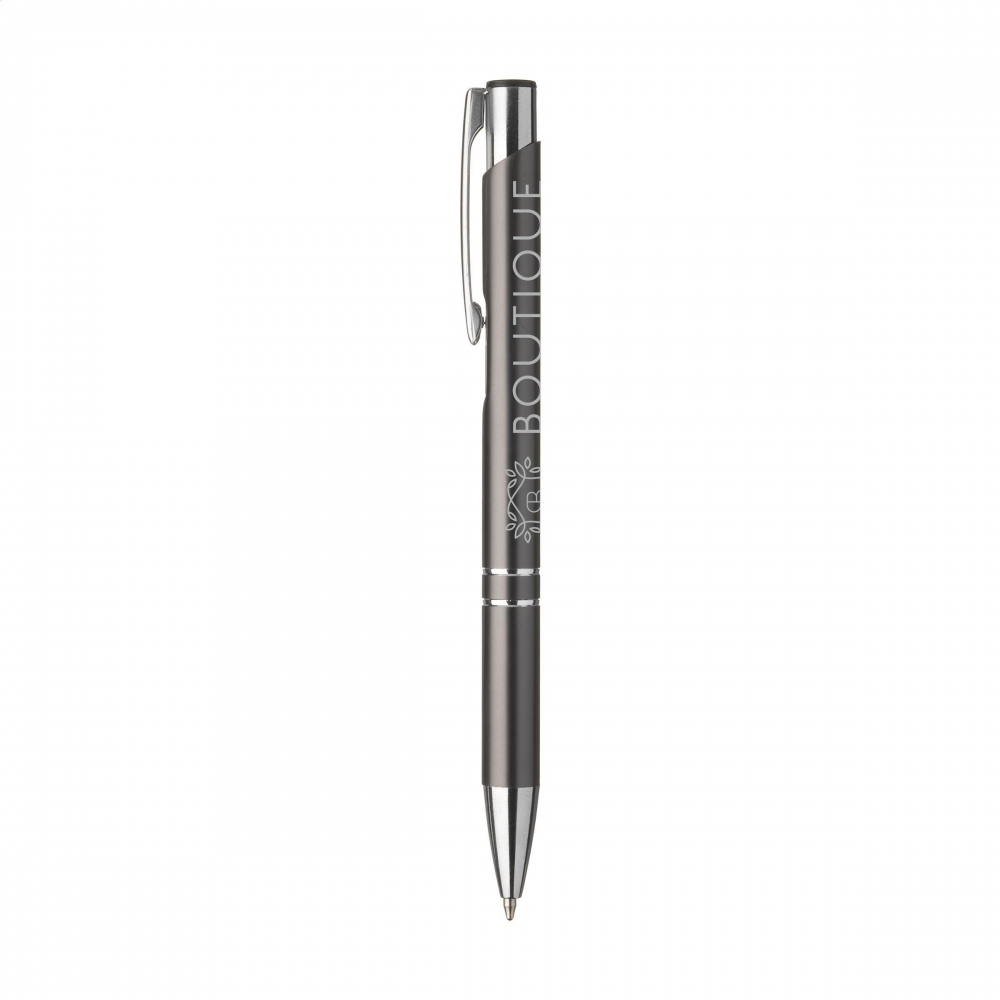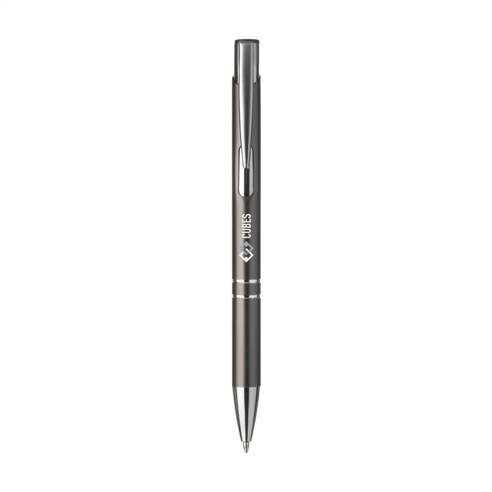 Artikel-Nr: CLP262569-387127Blauschreibender oder schwarzschreibender Kugelschreiber aus Aluminium mit mattfarbenem Gehäuse in Metalloptik und metallenem Clip / Druckknopf.