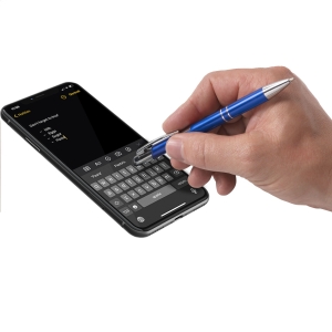 Artikel-Nr: CLP356930Blauschreibender Kugelschreiber mit Aluminiumgehäuse, gummierte Spitze zum Bedienen von Touchscreens (wie iPhone / iPad), mattfarbenes Metallgehäuse und Metallclip/-druckknopf.