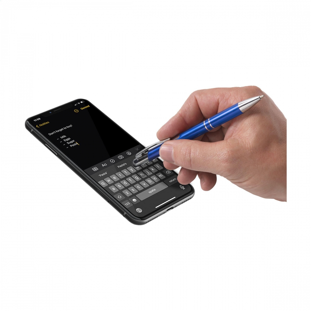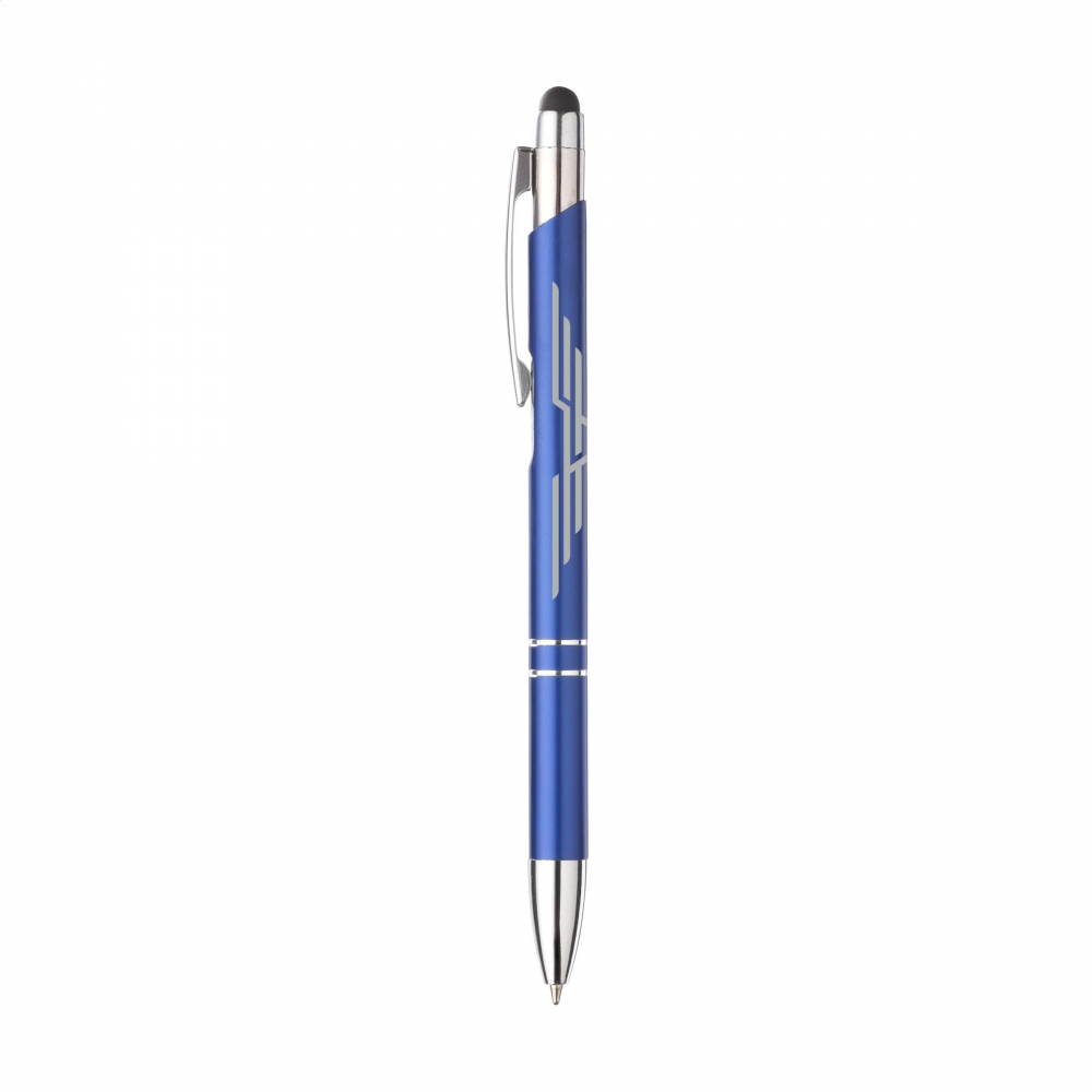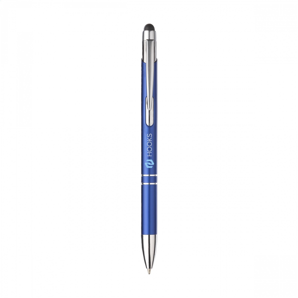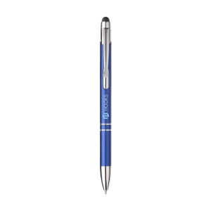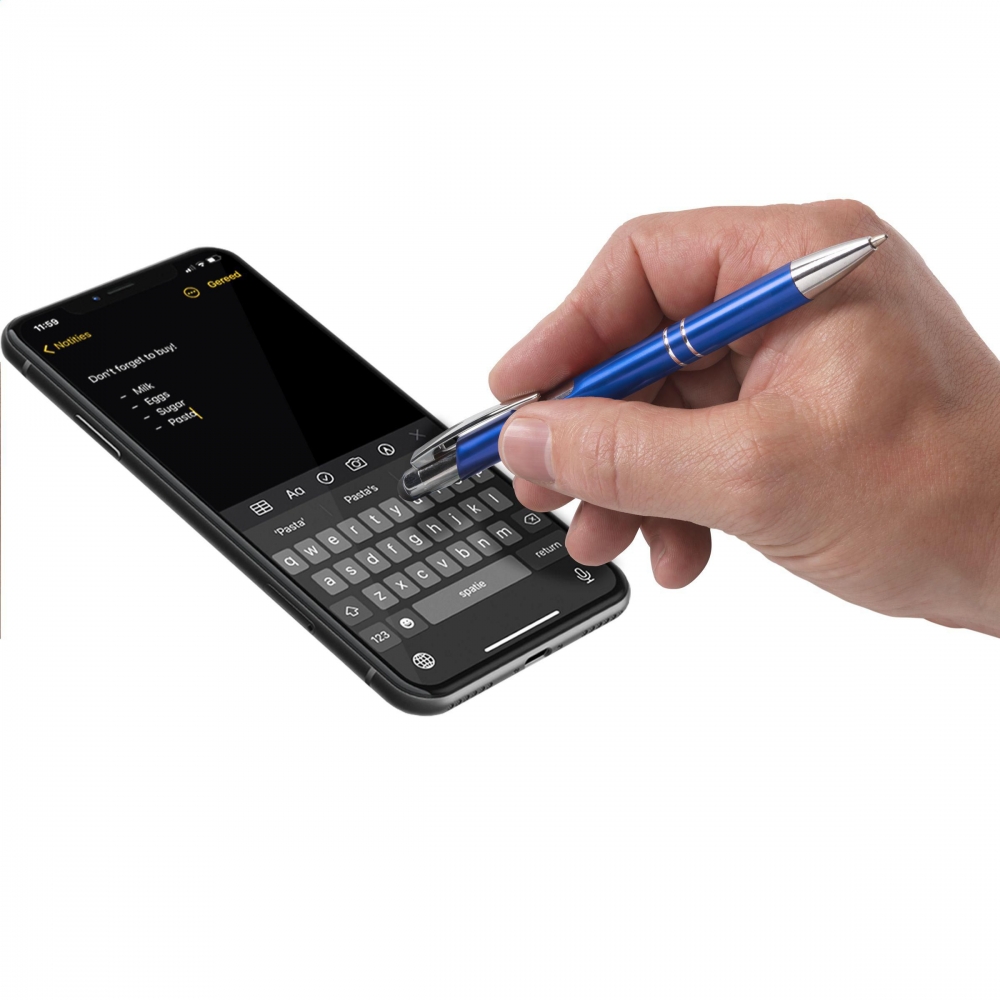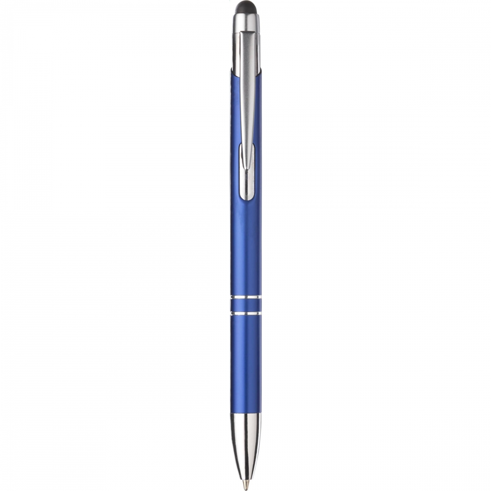 Artikel-Nr: CLP263569-005128Blauschreibender Kugelschreiber mit Aluminiumgehäuse, gummierte Spitze zum Bedienen von Touchscreens (wie iPhone / iPad), mattfarbenes Metallgehäuse und Metallclip/-druckknopf.
