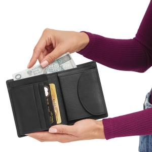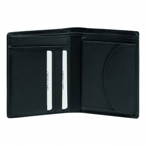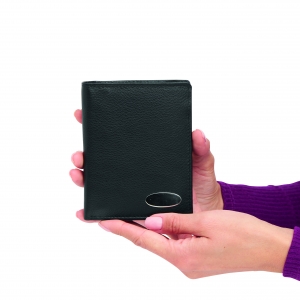 Artikel-Nr: INP56-0404446Echtleder-Geldbörse DOW JONES - im Hochformat: innen 6 Einsteckfächer für Geldkarten, 2 Geldscheinfächer, 1 Münzfach mit Druckknopfverschluss für Kleingeld, 1 Netzfach, 4 zusätzliche Fächer, 1 Fach für Einkaufswagen-Chip - außen mit ovaler Metallplatte für eine Werbeanbringung, in Box