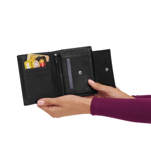 Artikel-Nr: INP56-0404465Echtleder-Geldbörse TRAPANI - im Hochformat: innen 9 Einsteckfächer für Geldkarten, 2 Geldscheinfächer, 1 Münzfach mit Druckknopfverschluss für Kleingeld, 1 Reißverschlussfach, 1 Klarsichtfach, 2 zusätzliche Fächer, in Box