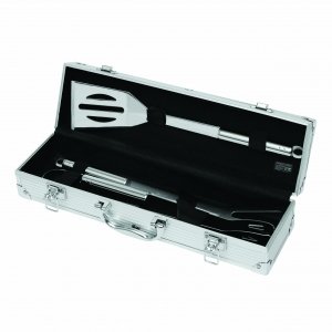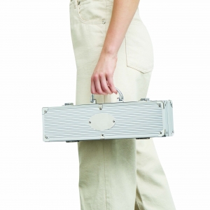 Artikel-Nr: INP56-0604016Edelstahl-Grillbesteck ROAST: bestehend aus Bratenwender, Fleischgabel und Grillzange, im silberfarbenen Koffer mit Tragegriff und Scharnierverschlüssen, in Box