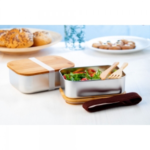 Artikel-Nr: AND800445Lunchbox aus Edelstahl mit Deckel aus natürlichem Bambus und Silikonband. Füllmenge: 800 ml.