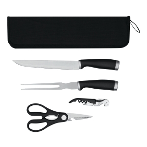 Artikel-Nr: INP56-0301154Edelstahl-Tranchierbesteck ROASTY, 4-teilig: bestehend aus Fleischmesser, Fleischgabel, Haushaltsschere und Kellnermesser, in schwarzer Nylon-Tasche mit Schlaufe, in Box