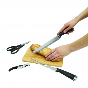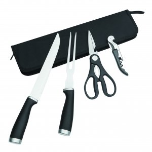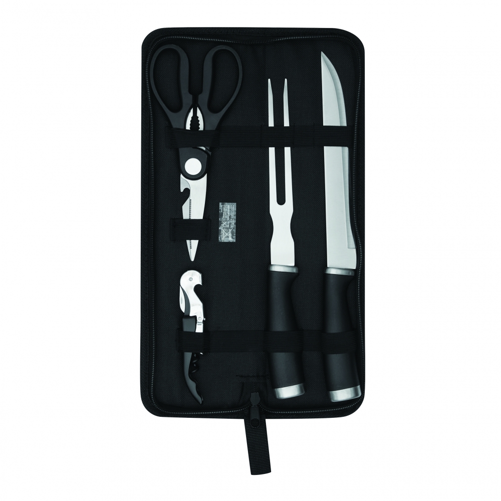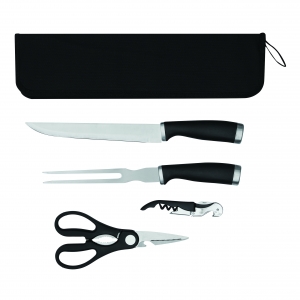 Artikel-Nr: INP56-0301154Edelstahl-Tranchierbesteck ROASTY, 4-teilig: bestehend aus Fleischmesser, Fleischgabel, Haushaltsschere und Kellnermesser, in schwarzer Nylon-Tasche mit Schlaufe, in Box