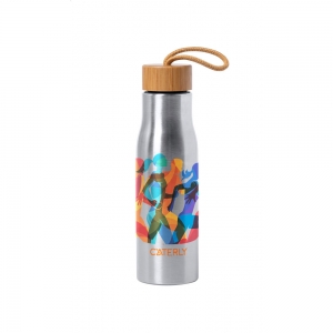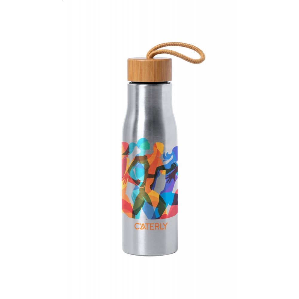 Artikel-Nr: AND721946-21Edelstahl-Trinkflasche mit Bambusverschluss und Trageschlaufe. Füllmenge: 550 ml.