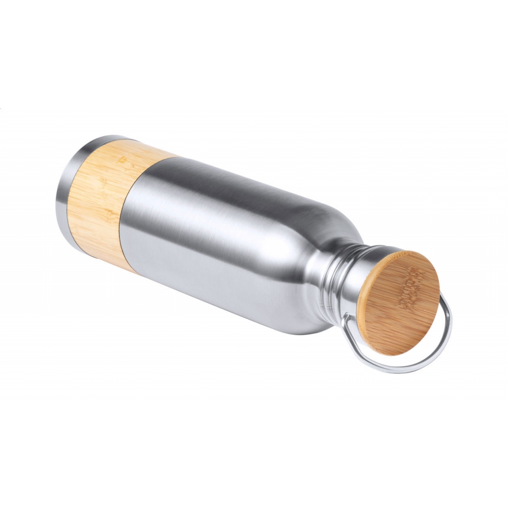 Artikel-Nr: AND722530-21Edelstahl-Trinkflasche mit Einlage und Tragedeckel aus Bambus. Füllmenge: 750 ml.