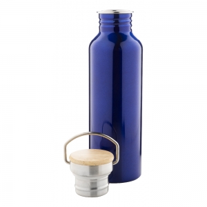 Artikel-Nr: AND721169-06Farbige Edelstahl-Trinkflasche mit Tragedeckel aus Bambus. Füllmenge: 800 ml.