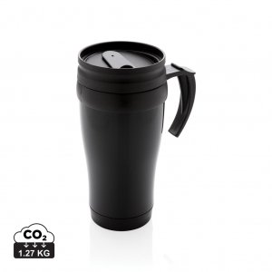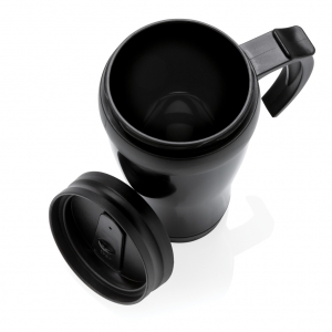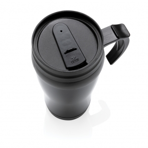 Artikel-Nr: XND432131350ml Edelstahltasse, innen mit Kunststoff ausgekleidet, Deckel mit Schiebeöffnung. Nur Handwäsche.