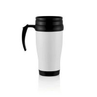 350ml Edelstahltasse, innen mit Kunststoff ausgekleidet, Deckel mit Schiebeöffnung. Farbe: weiß Maße (cm): 12 x 8 x 18, ø 8 Gewicht (g): 245 Druckfläche (mm): 35 x 35
