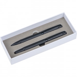 Artikel-Nr: EAG475903Hochwertiges blauschreibendes Schreibset bestehend aus einem Rollerball und einem Drehkugelschreiber, mit schwarzschreibender Mine im eleganten Design. Veredelt mit dem MoLu Logo, schwarz matt bedruckt auf dem schwarzen Ring. Perfekt für stilvolles Schreiben und ein exklusives Geschenk! Ihre Werbung bringen wir mittels einer Lasergravur auf beiden Schreibgeräten an.