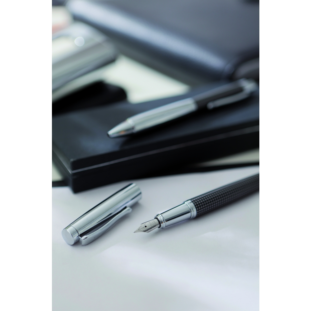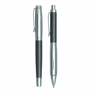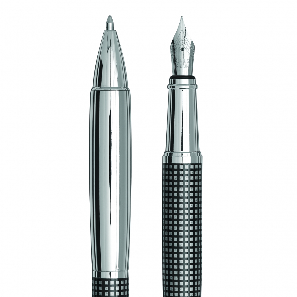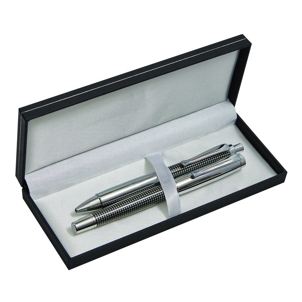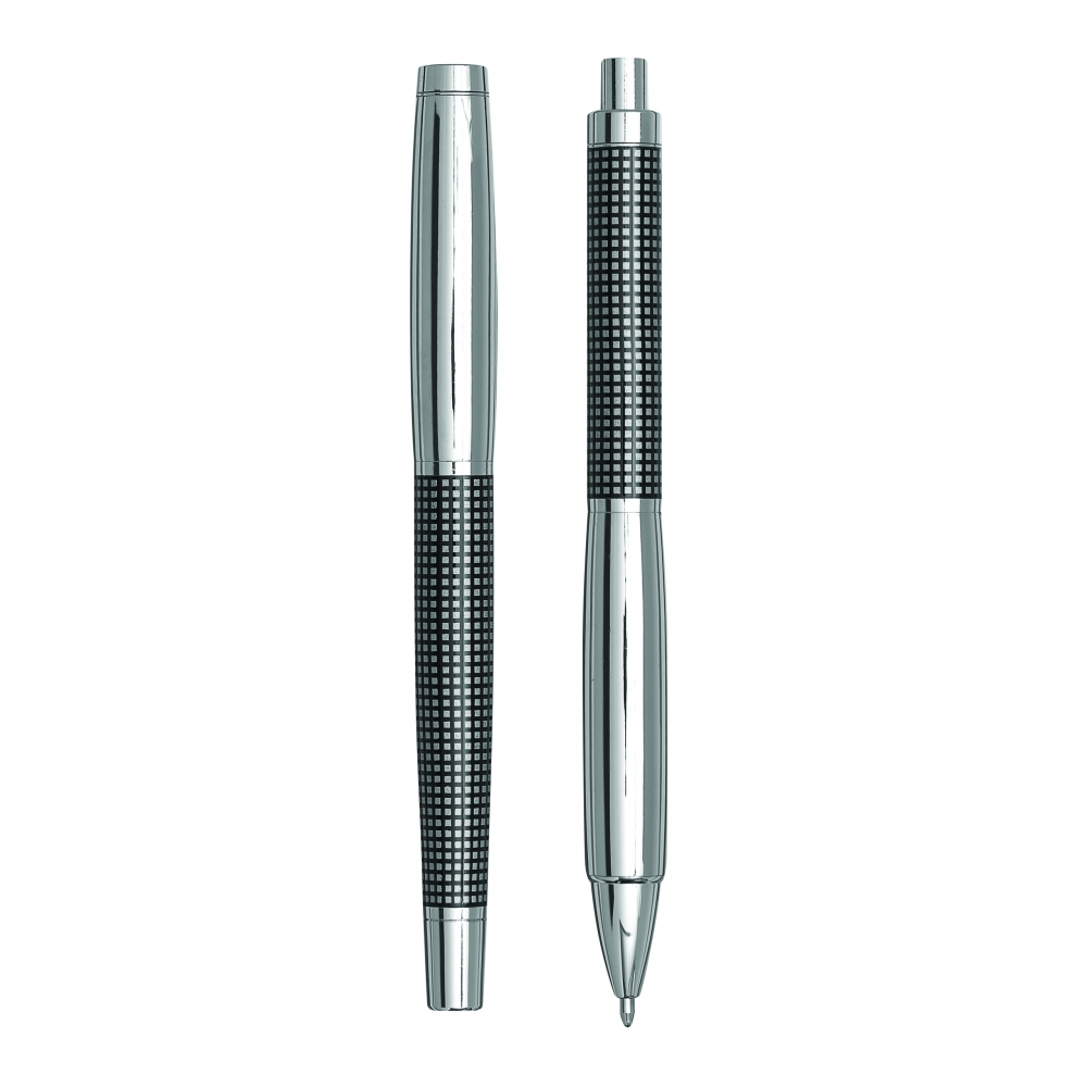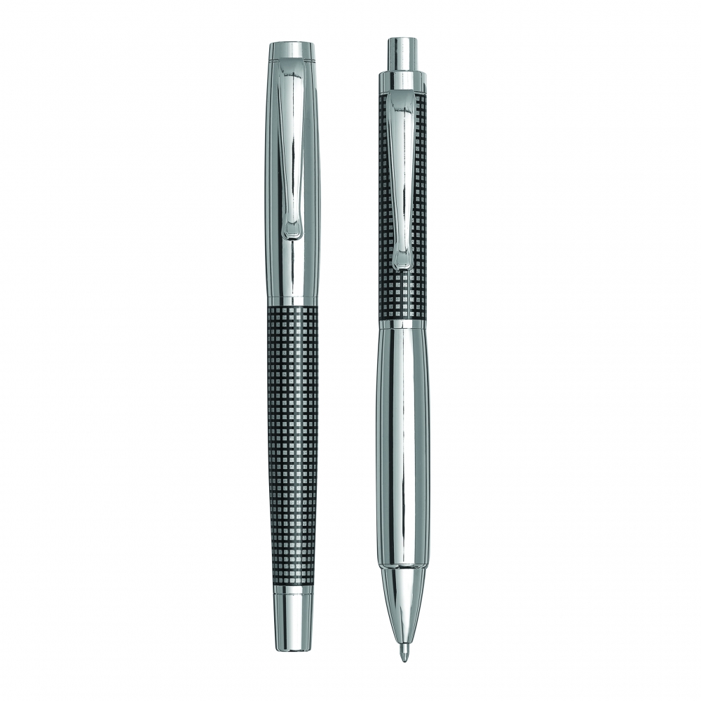 Artikel-Nr: INP56-1101662Edles Schreibset NOBLESSE, 2-teilig: bestehend aus Kugelschreiber mit Druckmechanismus (blauschreibend) sowie Füllfederhalter mit Verschlusskappe mit Clip, inkl. 1 Tintenpatrone, beide Schreibgeräte mit Metall-Schaft und kariertem Dekor, im Etui
