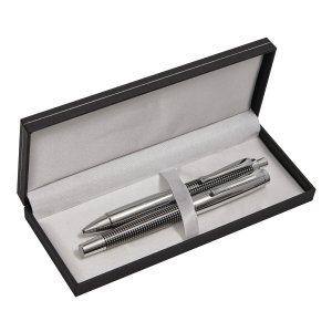 Artikel-Nr: INP56-1101662Edles Schreibset NOBLESSE, 2-teilig: bestehend aus Kugelschreiber mit Druckmechanismus (blauschreibend) sowie Füllfederhalter mit Verschlusskappe mit Clip, inkl. 1 Tintenpatrone, beide Schreibgeräte mit Metall-Schaft und kariertem Dekor, im Etui