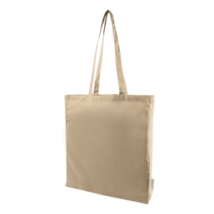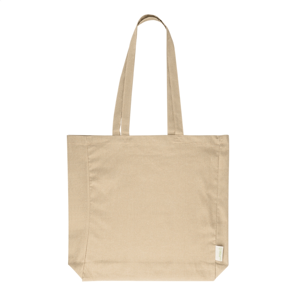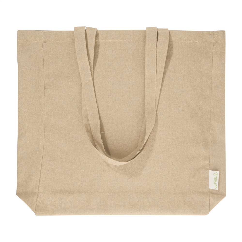 Artikel-Nr: AND800692-00Einkaufstasche mit Seitenfalte und langen Henkeln. Material: 70% recycelte Baumwolle und 30% RPET Polyester, 140 g / m². Mit Label RPET.
