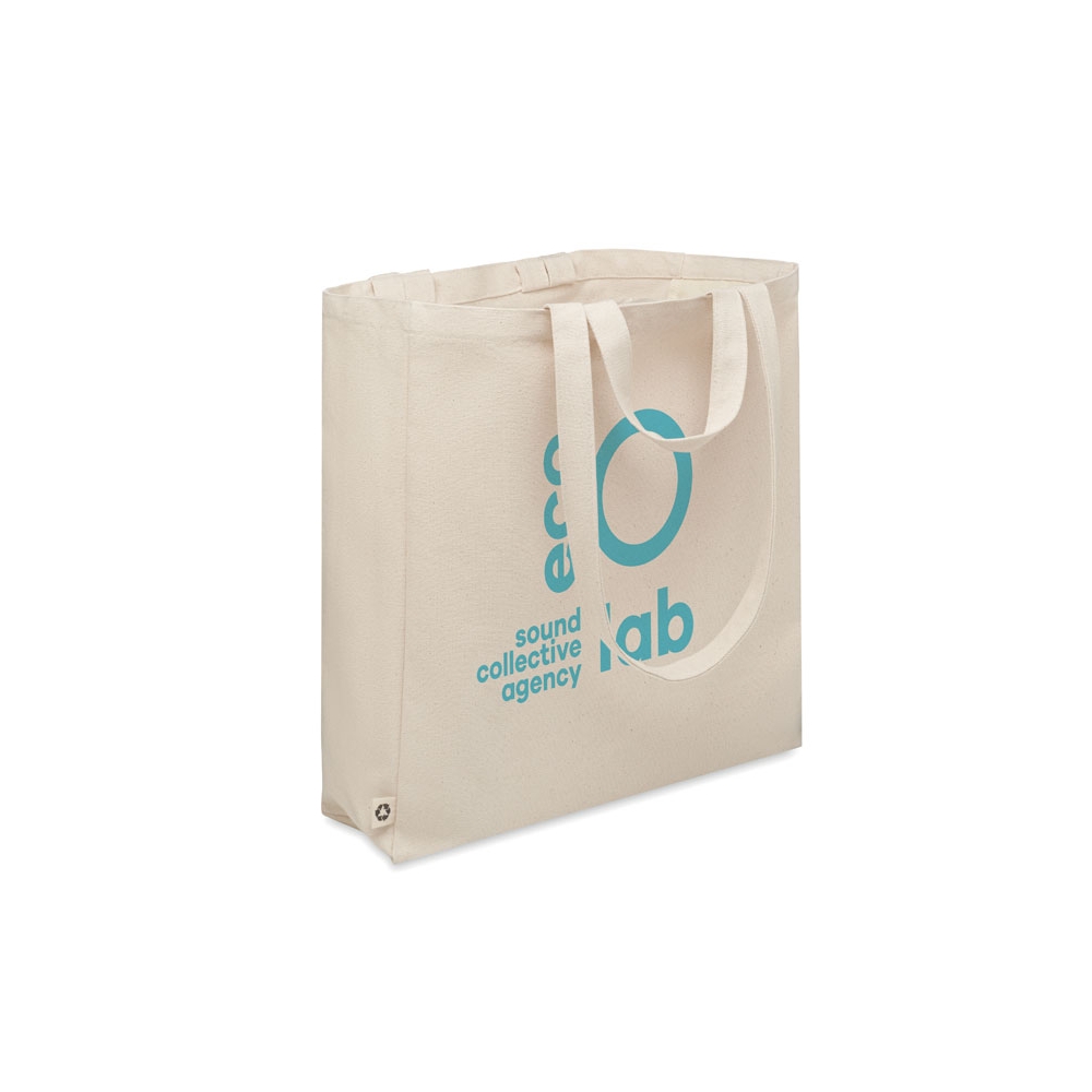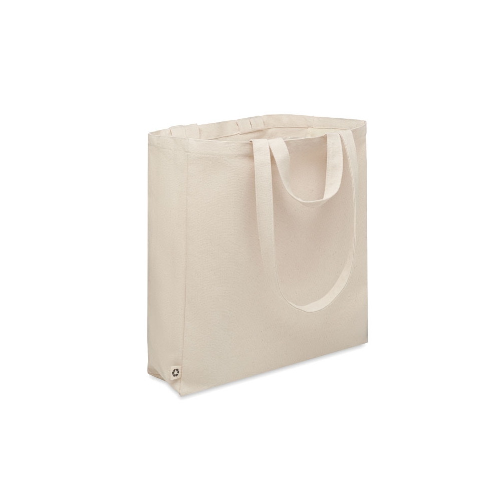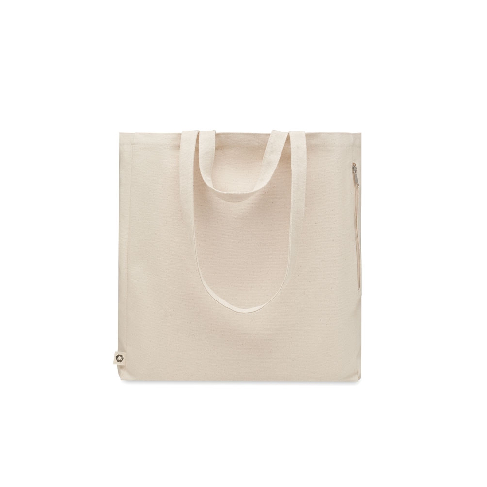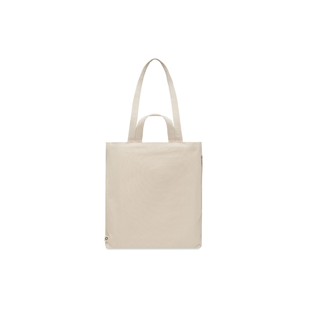 Artikel-Nr: OCBMO6749-13Einkaufs- oder Strandtasche aus recyceltem Polycotton (70% recycelte Baumwolle, 30% recycelter Polyester) mit kurzen und langen Griffen. Sie hat eine Seitentasche mit Reißverschluss. 380 g / m².
