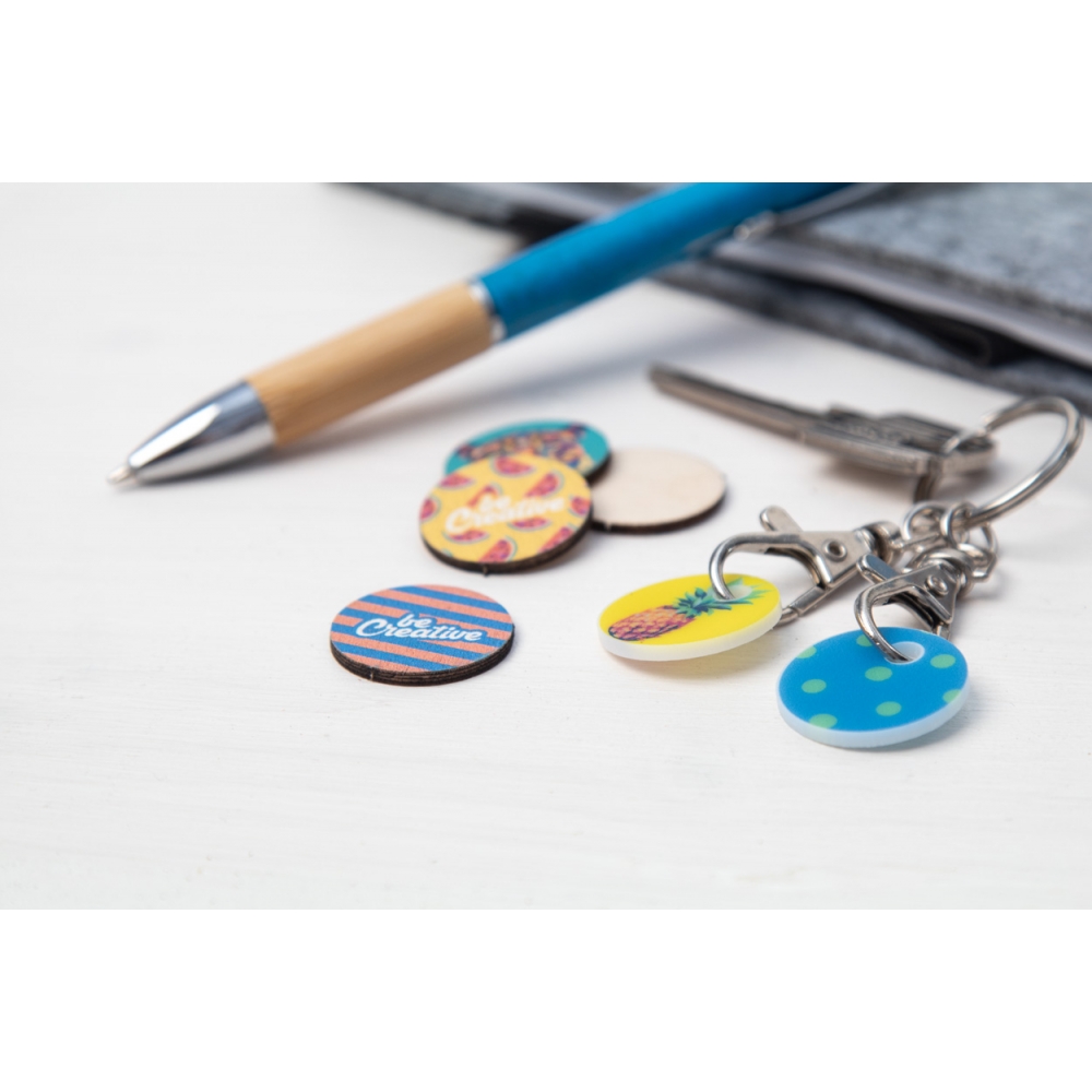 Artikel-Nr: AND716751Karabiner-Schlüsselanhänger aus Metall mit EKW-Chip aus Kunststoff (Chip-Maße: ø23×2 mm) mit vollfarbiger Bedruckung. Der Preis ist inklusive UV LED Druck auf einer Seite. Mindestmenge: 200 Stk.