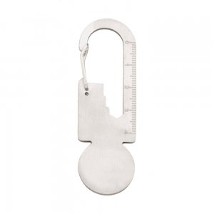 Artikel-Nr: AND808263Multitool aus recyceltem Edelstahl mit Karabiner, Einkaufswagen-Chip, Lineal und 3 Flachschlüsseln.
