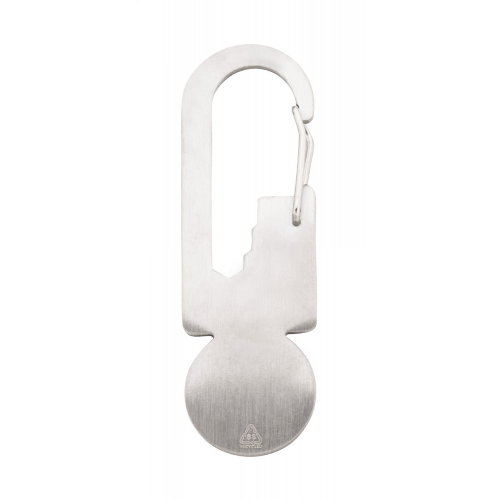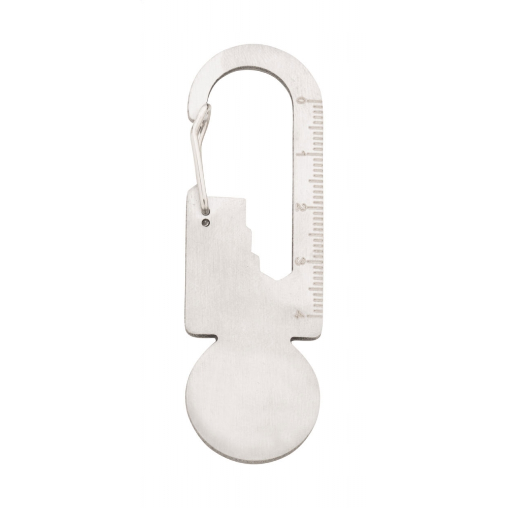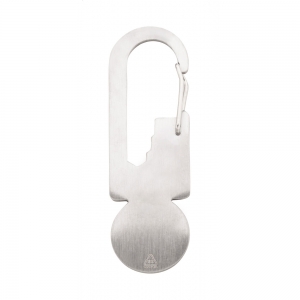 Artikel-Nr: AND808263Multitool aus recyceltem Edelstahl mit Karabiner, Einkaufswagen-Chip, Lineal und 3 Flachschlüsseln.