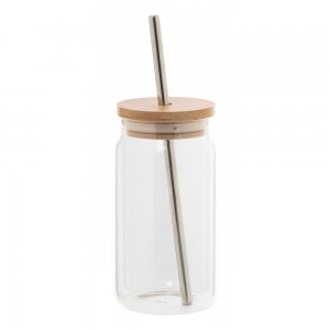 Artikel-Nr: AND800302Einmachglas-Becher aus Borosilikatglas mit Bambusdeckel und Trinkhalm aus recyceltem Edelstahl. Füllmenge: 450 ml.
