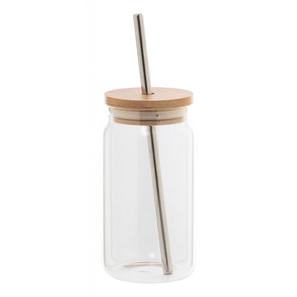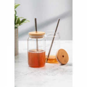 Artikel-Nr: AND800302Einmachglas-Becher aus Borosilikatglas mit Bambusdeckel und Trinkhalm aus recyceltem Edelstahl. Füllmenge: 450 ml.