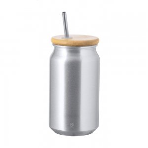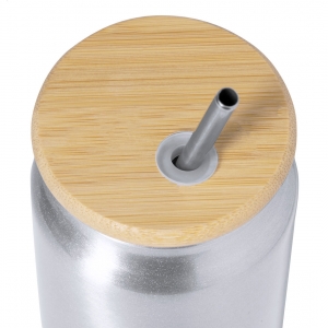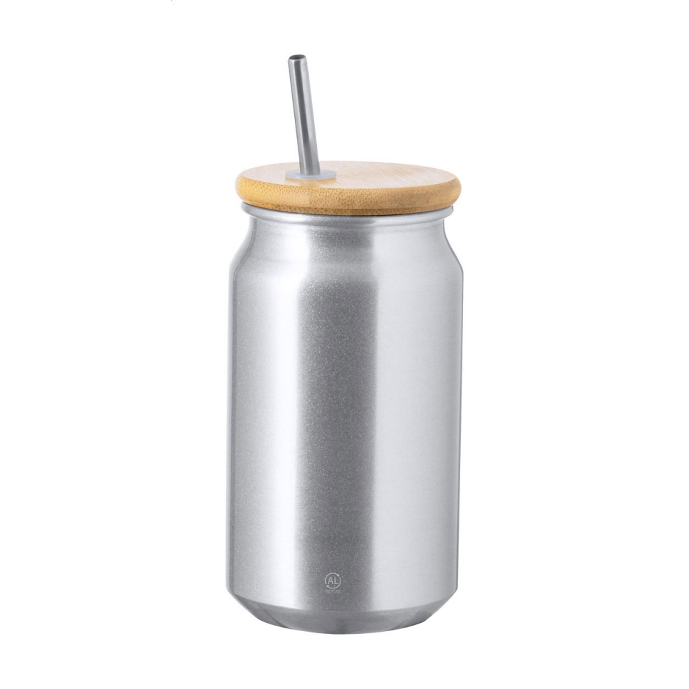 Artikel-Nr: AND733346-21Einmachglas-Tasse aus Aluminium mit Bambusdeckel und Trinkhalm aus Edelstahl. Füllmenge: 430 ml. Einzeln in Kraftpapierbox.