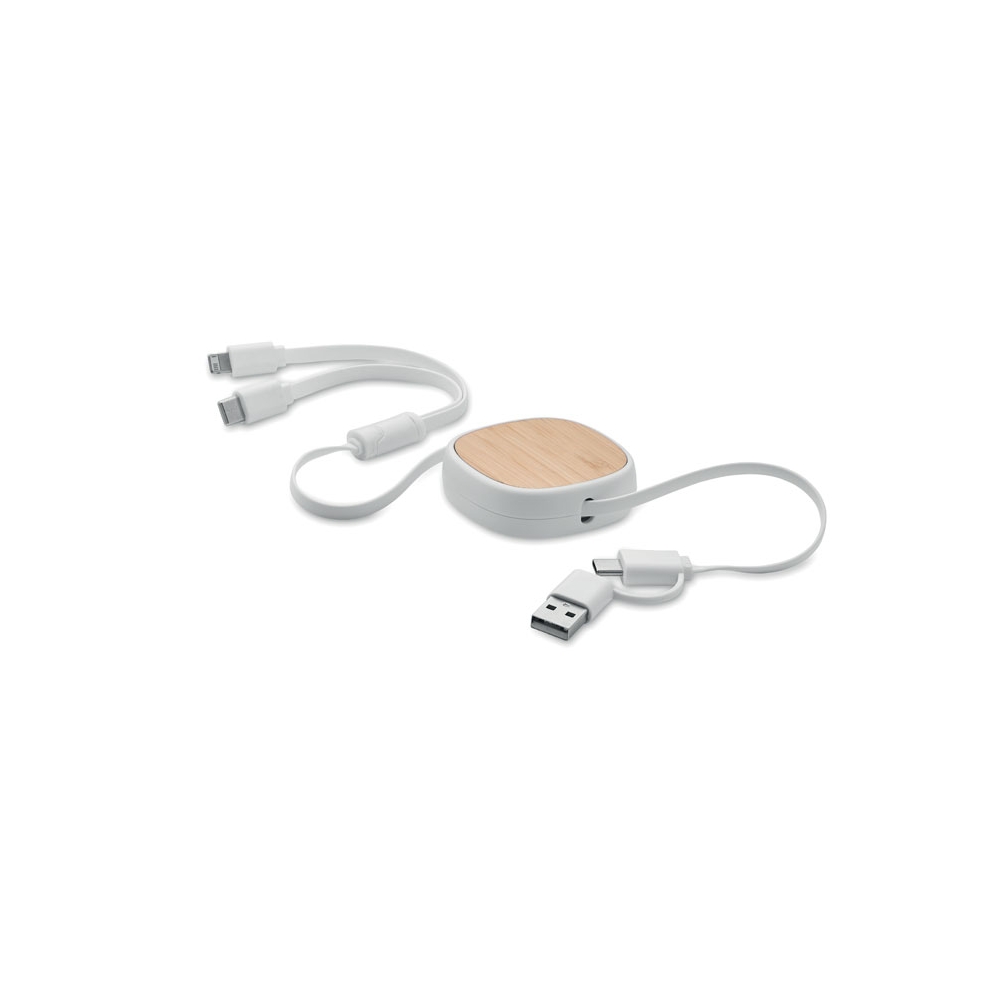 Artikel-Nr: OCBMO2146-06Einziehbares USB-Ladekabel. ABS mit Bambus-Dekor. Eingang: 2in1 Typ-C und Typ-A. Ausgang: Typ-C und 2in1 Micro-B und Anschluss. Kabellänge: 90 cm.