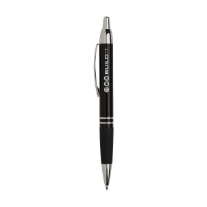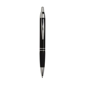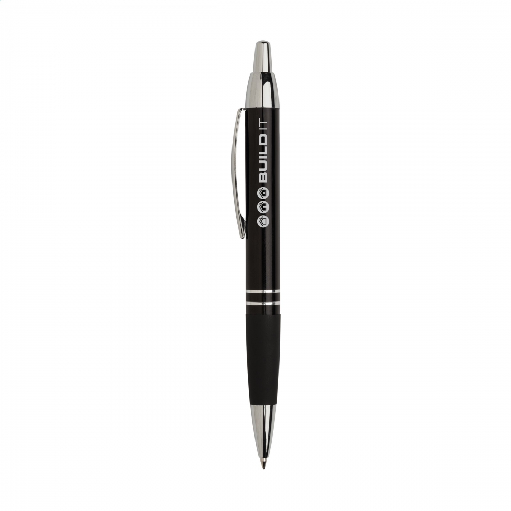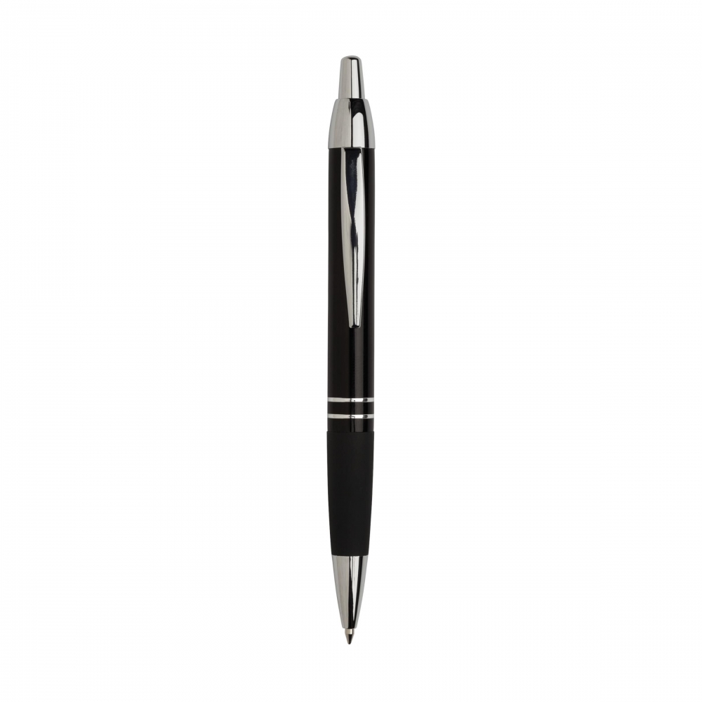 Artikel-Nr: CLP344598Blauschreibender, metallener Kugelschreiber mit hochglänzendem Gehäuse in Metalloptik, gummierte Grifffläche, fester Metallclip und Druckknopf und silberfarbene hochglänzende Akzente.