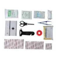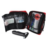 Artikel-Nr: 688PLR034Erste Hilfe Set aus rotem Nylon bestehend aus folgenden Bestandteilen: Erste-Hilfe-Ratgeber, Schere, Plastikpinzette, Vinylhandschuhe, Heftpflaster, 4 Alkoholtücher, 17 Stoffbinden, 1 dehnbare Binde 6cmx4m, 1 Dreiecksverband, 4 sterile Kompressen 5 x 5 cm, 1 Rettungsdecke zweiseitig (silberne und goldene Seite) 1 Notfallhammer mit Gurtschneider.