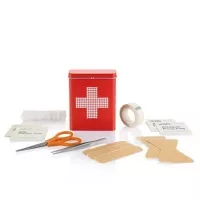 18tlg., inkl. Pflaster, antiseptischen Auflagen, Mullbinde, Pinzette, Klebeband und Schere, konfektioniert in Metallbox, EN 13485 konform. Farbe/n: rot. Maße ca. 3,1 x 7,5 x 9,1 cm.